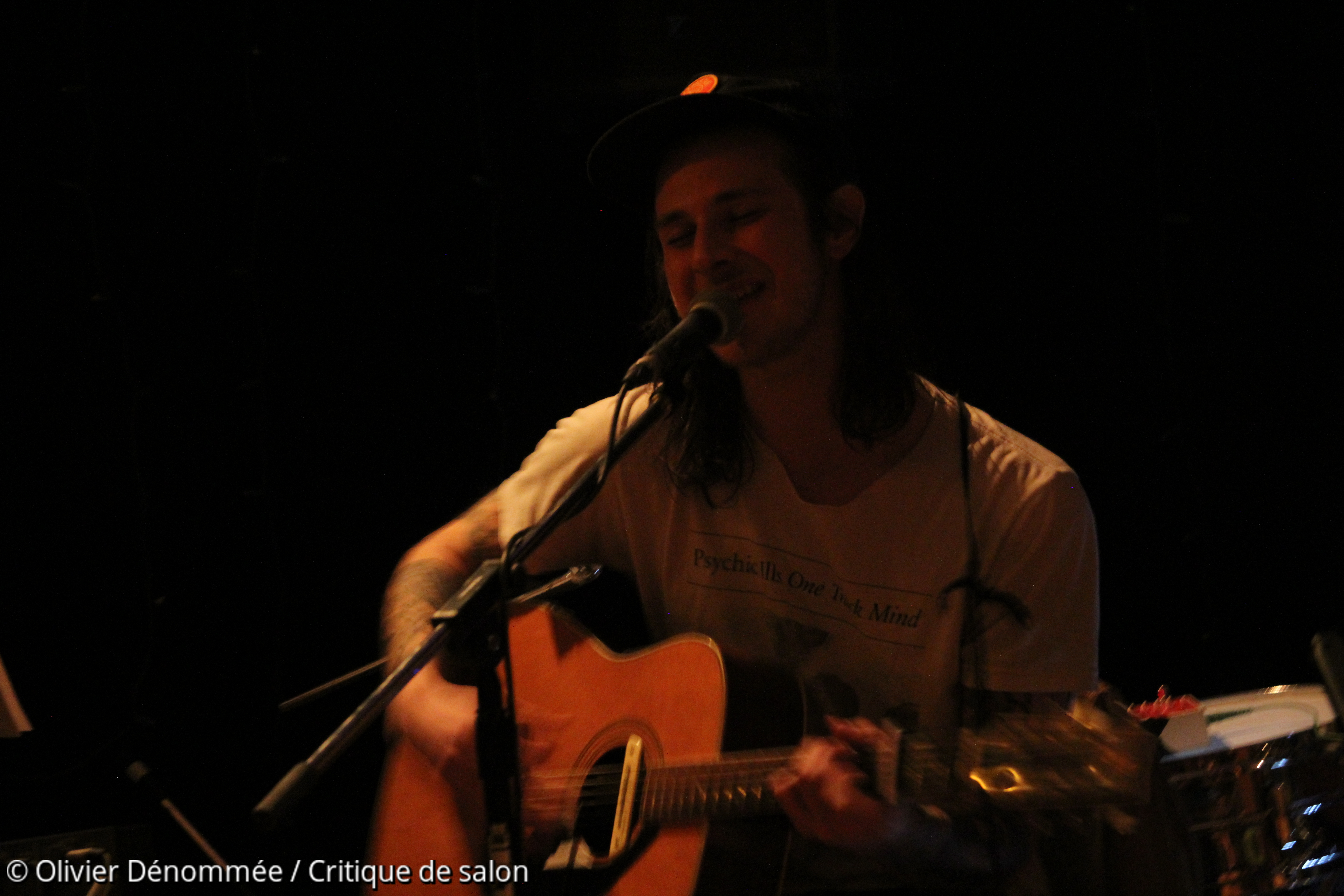 Tambour était au cœur de cette soirée de financement, mais le groupe n’est pas venu seul : en première partie, l’artiste Gabriel Vallée, seul avec sa guitare, a interprété quelques chansons. Il a joué pendant une vingtaine de minutes, offrant des chansons au ton souvent très doux et aérien, avec du reverb, beaucoup de reverb. Le Studio B était attentif et tout ce qui manquait à Gabriel Vallée était un éclairage digne de ce nom; c’est parce qu’on le réservait pour le clou du spectacle. Quoi qu’il en soit, cette performance très sobre a su réchauffer la foule, qui allait encore attendre quelques dizaines de minutes avant que le band de Simon Piché-Castonguay prenne la place.