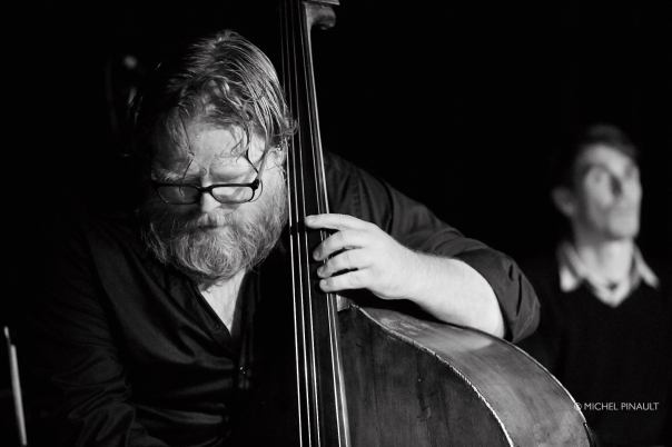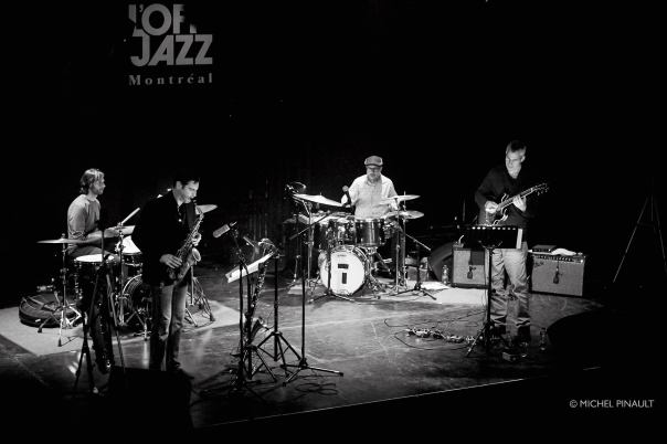 C’est finalement avec la prestation de Samuel Blais et ses invités que s’est clôturé le festival et vraiment, il fallait y être. C’est avec aisance et humour que le saxophoniste et compositeur Samuel Blais s’est présenté sur la scène de l’Astral. Visiblement heureux d’être accompagné pour la première fois sur scène de deux batteries (et oui), il semblait surtout fier de pouvoir présenter quelques pièces de son plus récent opus, paru le mois dernier. En deux sets d’environ 50 minutes, nous avons pu nous délecter des musiques variées, passant d’un style contemporain à un jazz métal. Si la présence de deux batteries nous laissait perplexe d’emblée, la justification n’en fut que plus agréable alors que nous avons rapidement constaté le dialogue entre les deux instruments qui, vraiment, se complétaient brillamment. Ajoutons à cela un guitariste hors pair tel que Ben Monder, qui se faufile dans cette musique avec subtilité et finesse.