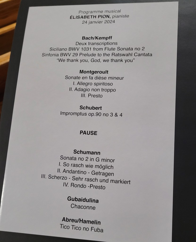 Élisabeth Pion a promis de la belle musique et elle a tenu parole : son récital a commencé avec 2 transcription de Bach faites par Wilhelm Kempff, une bien belle entrée en matière passant d’une certaine douceur à une pluie de notes. Le plus impressionnant était probablement d’apprendre après le récital qu’elle n’a travaillé ces pièces que dans le dernier mois et demi, chose qu’il était impossible à deviner (à titre de référence, son travail sur le concerto joué quelques jours plus tôt aura pris près de 2 ans).